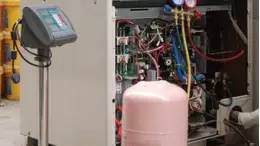 通過電子秤準確補充液態(tài)制冷劑量;充注時請注意制冷劑瓶的方向。